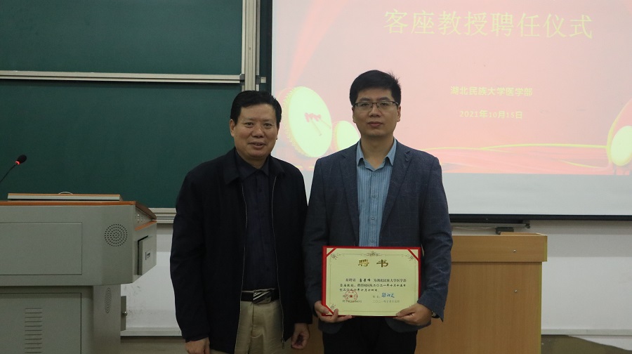 本网讯(通讯员 袁子涵 许旖蕾/文 夏雪花/图)10月15日,湖北工业大学生物工程与食品学院副院长、生物医药研究院院长唐景峰教授受邀到医学部开展学术讲座。党委副书记、副校长汪兴平为为唐景峰颁发“客座教授”特聘证书,医学部、风湿病重点实验室等老师及医学部100余名研究生、本科生参加本次讲座。讲座由医学部常务副主任罗洪斌主持。