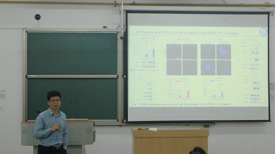 讲座伊始,罗洪斌向大家介绍唐景峰教授,汪兴平为唐景峰颁发“客座教授”特聘证书。随后,唐景峰教授围绕主题 “New Role of STYK1 in Autophagy regulation, cancer development and drug resistance”开展讲座。他提到,STYK1因子分别在自噬调控、癌症发展和耐药性三个方面的新作用,并详细向大家介绍STYK1因子。他通过数据分析与实验结果向大家讲述STYK1因子的调控机制和今后研究方向。