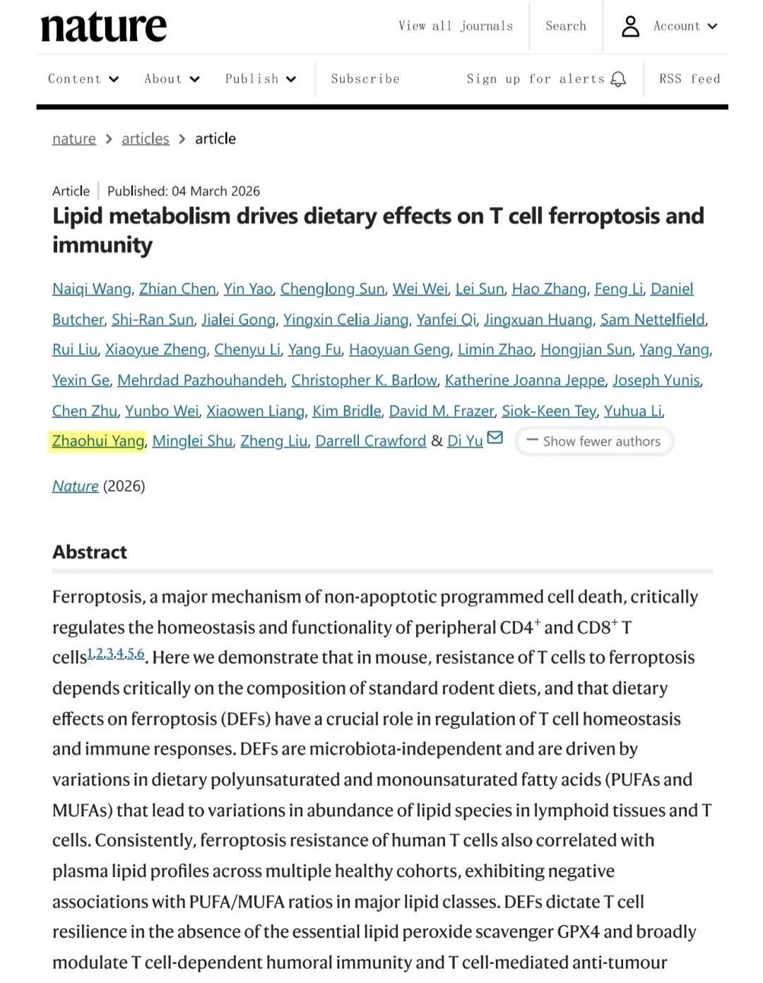 3月5日,国际顶级学术期刊《自然》(Nature)正刊在线发表重磅研究成果《Lipid metabolism drives dietary effects on T cell ferroptosis and immunity》(脂质代谢驱动饮食对T细胞铁死亡和免疫的影响)。365电子娱乐官方网站附属民大医院为第一作者单位。