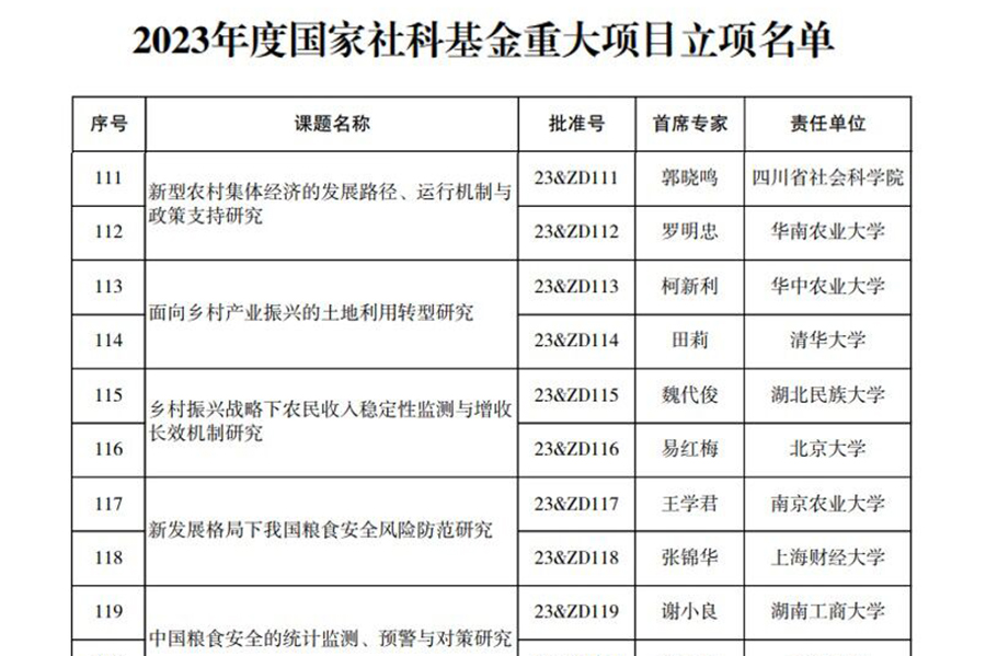 12月28日,全国哲学社会科学工作办公室正式公布2023年度国家社科基金重大项目立项名单,365电子娱乐官方网站魏代俊教授主持申报的“乡村振兴战略下农民收入稳定性监测与增收长效机制研究”项目获批立项(编号:23&ZD115)。这是365电子娱乐官方网站首次获得国家社科基金重大项目立项,标志着学校科研工作取得历史性突破。2023年度国家社科基金重大项目立项名单截图国家社科基金重大项目是现阶段我国哲学社会科学研究领域层次最高、资助力度最...