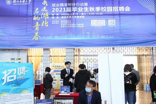 招聘会现场毕业生查看招聘信息本网讯(记者 杨颖 张宏迪 通讯员 夏厚照/文 通讯员 杨萌 苏瞳/图)11月7日,由湖北省教育厅主办,我校联合恩施州公共就业和人才服务局、恩施市公共就业和人才服务局共同承办的“我选湖北 起航青春”就业精准帮扶行动暨2021届毕业生秋季校园招聘会在篮球馆举行。此次招聘会共有84家企业参展,提供200余个工作岗位,招聘人数5000余人,企业类型涵盖教育、房地产、农业、科技、营销、服务等。在各企...