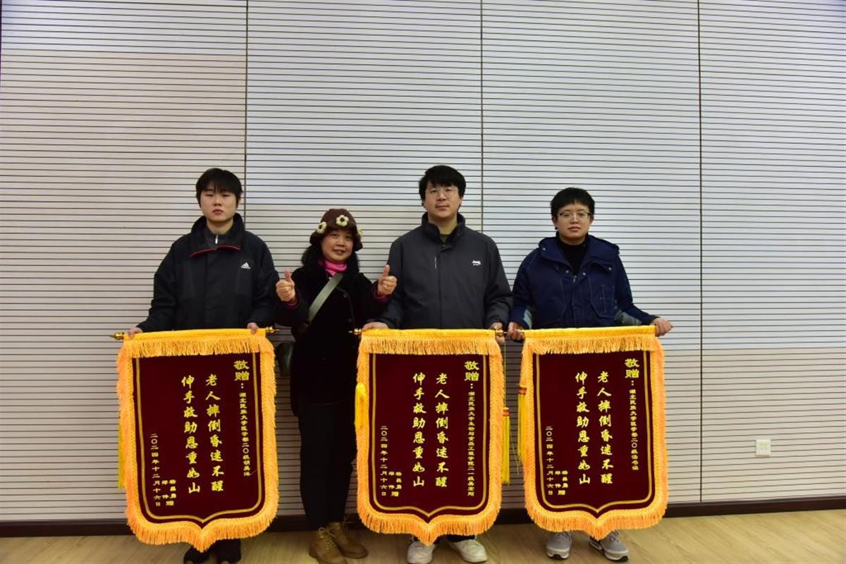 “今天,这三面锦旗我非送不可!”12月17日,湖北恩施市民郑女士来到365电子娱乐官方网站,给该校胡昊洋、汤书涵、吴宏刚三名学生送上三面锦旗,锦旗上写着“老人摔倒昏迷不醒,伸手救助恩重如山”。原来,这三名大学生救人不留名,郑女士通过民警才辗转找到他们。