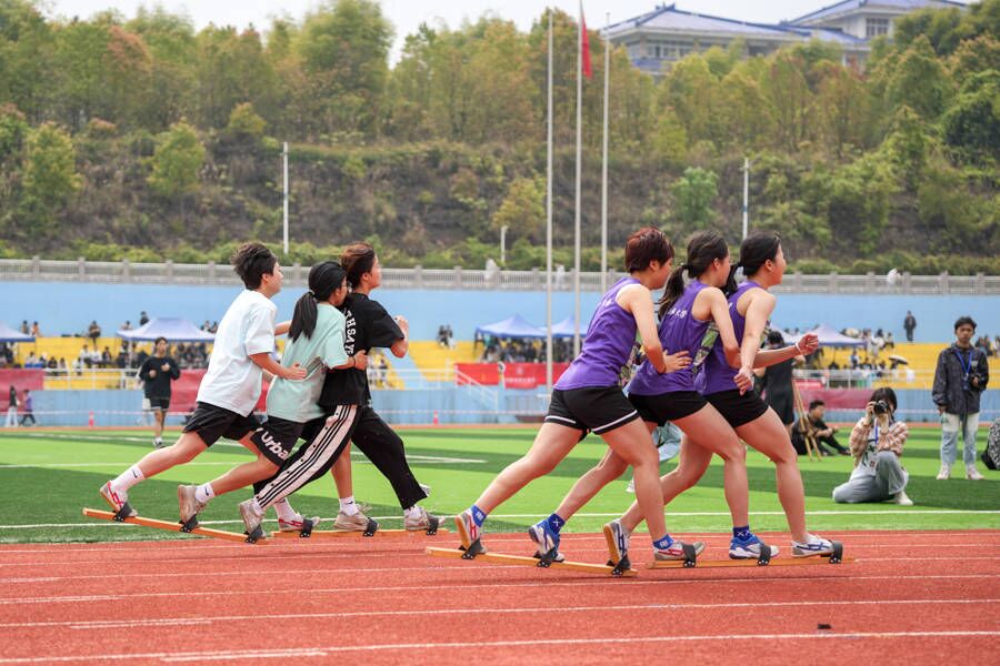 迎春启程 向阳而行,驰骋赛场,热血燃烧。4月11日上午,30m板鞋竞赛运动员三人一组,共穿一双长板鞋,默契协作、齐心协力,朝着终点线全力奔赴