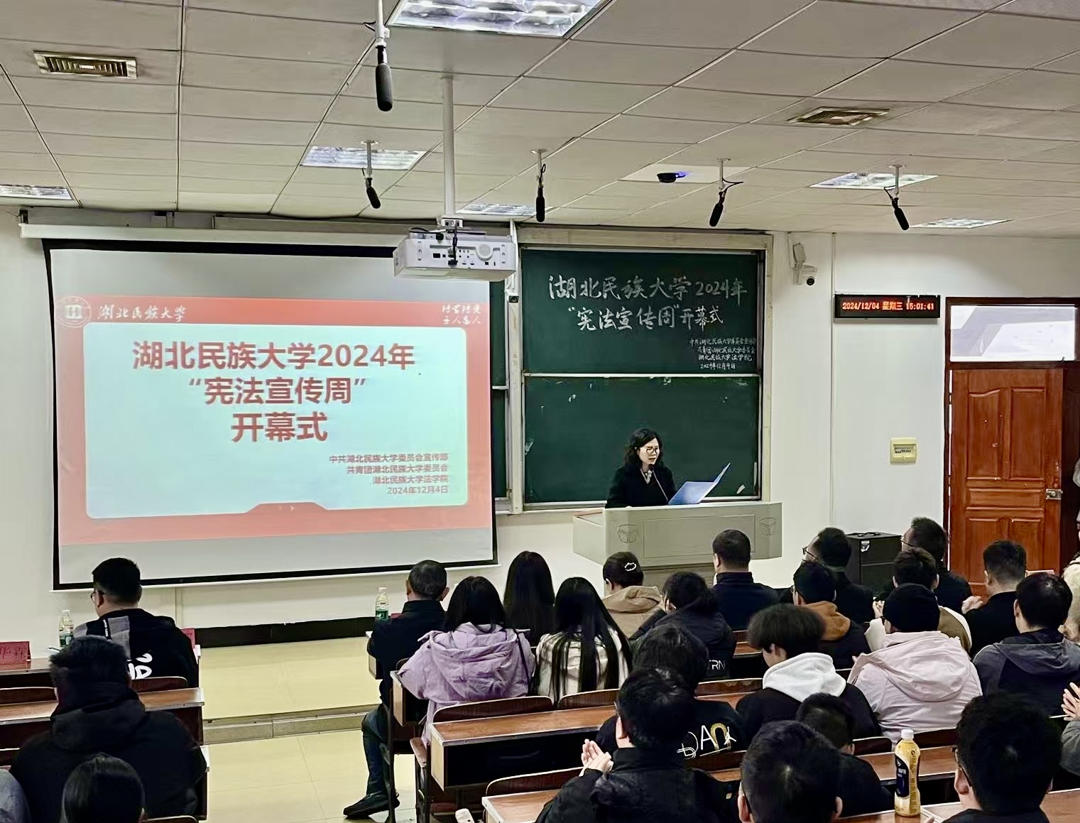 12月4日是第十一个国家宪法日,由中共365电子娱乐官方网站委员会宣传部、共青团365电子娱乐官方网站委员会主办,365电子娱乐官方网站法学院承办的“宪法宣传周”开幕式在德智楼9A410教室举行。法学院法学系主任冉艳辉主持开幕式。恩施州人大法制委员会主任委员、常委会法制工作委员会主任吴以忠,恩施州人大常委会法制工作委员会办公室主任刘浏,学校党委宣传部、研究生部(处)、校团委等相关单位负责人,法学院师生参加开幕式。开幕式现场全体成员...