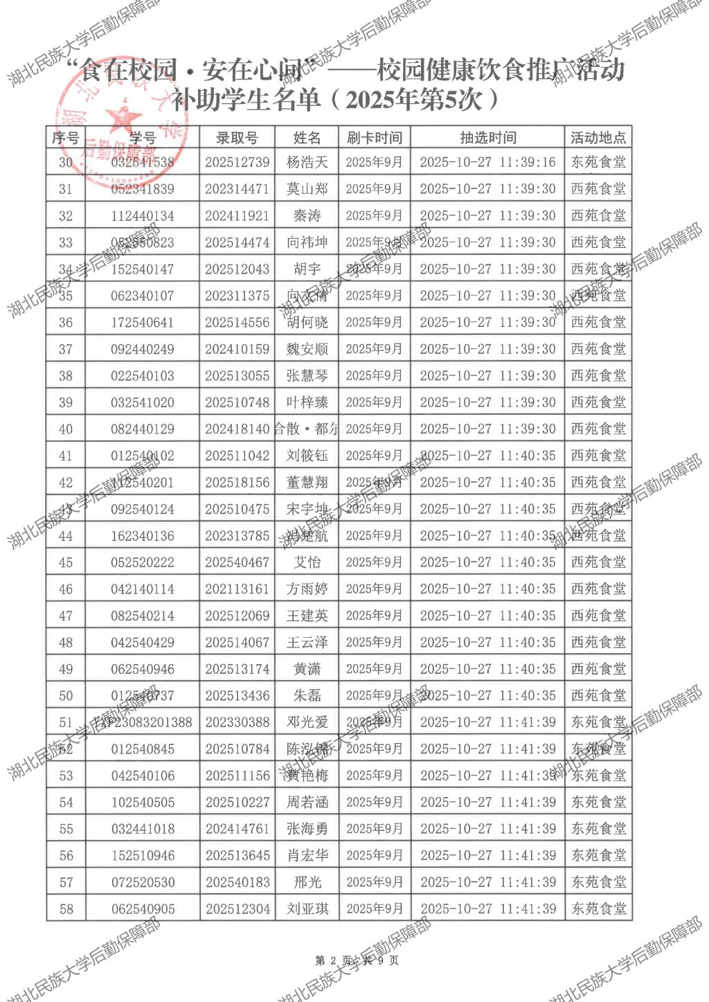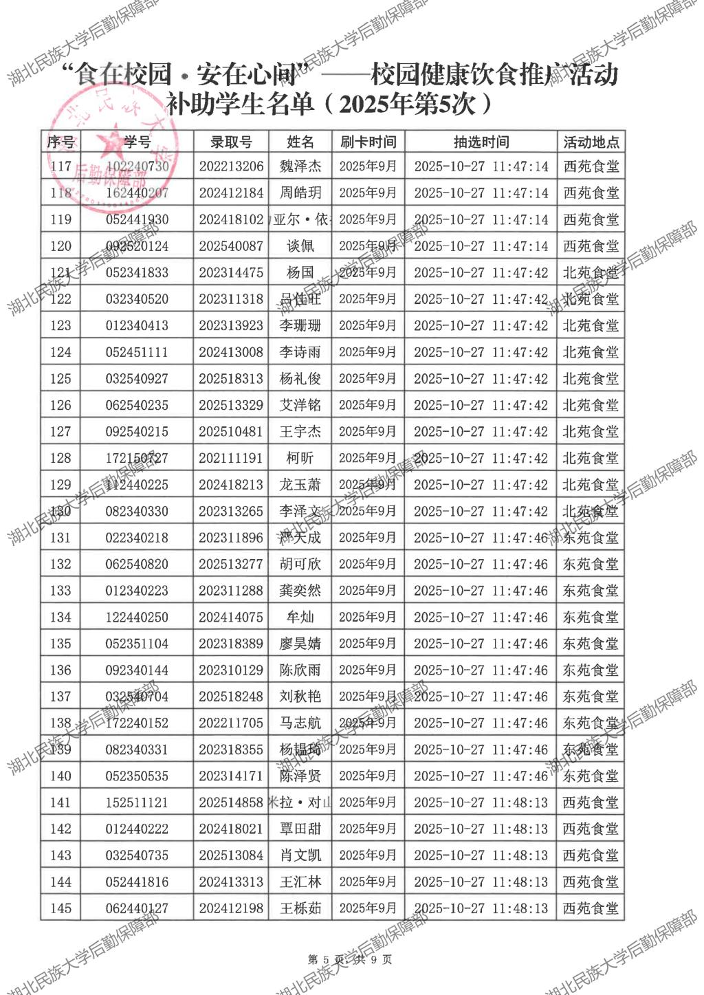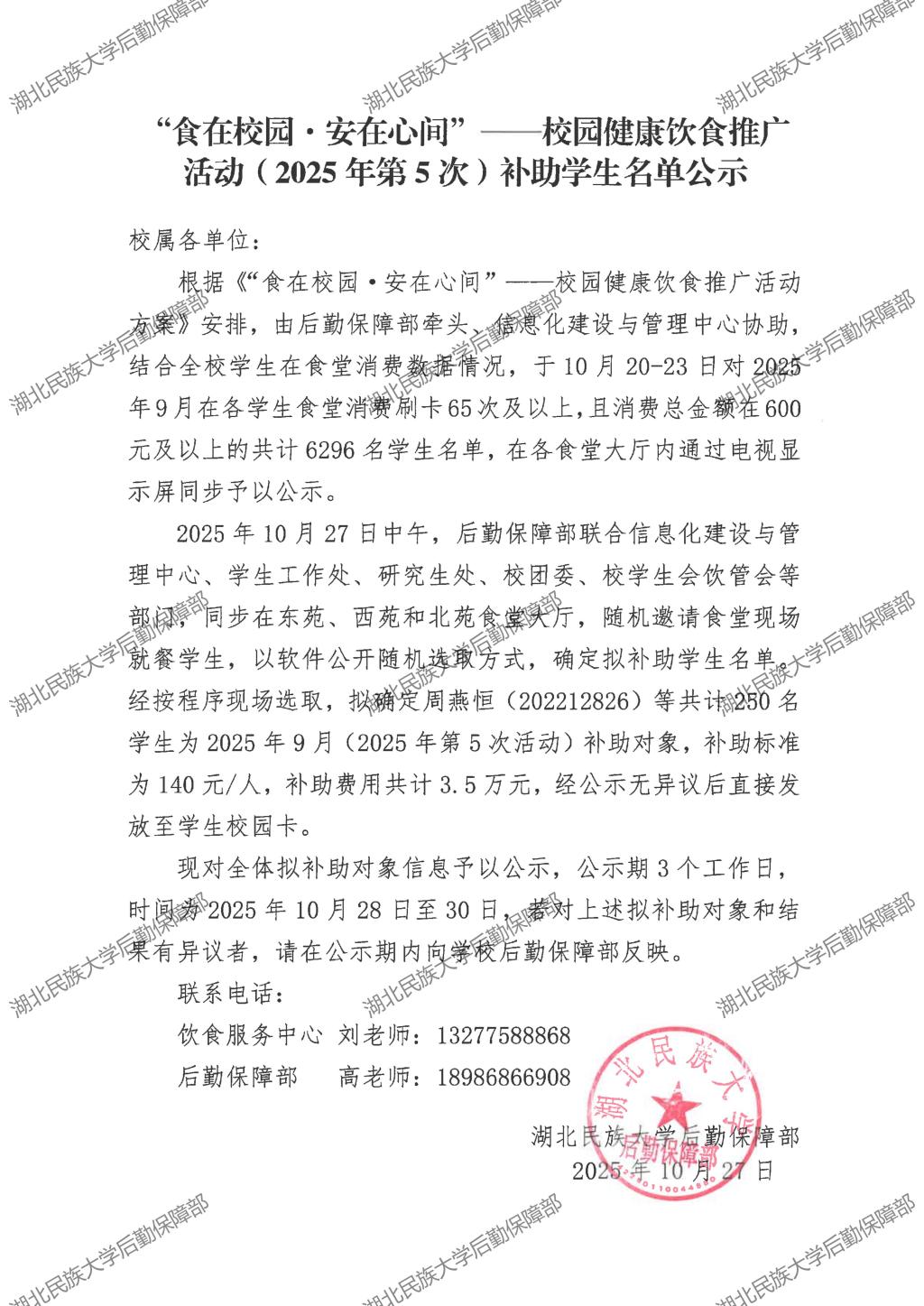 “食在校园·安在心间”——校园健康饮食推广活动(2025年第5次)补助学生名单公示