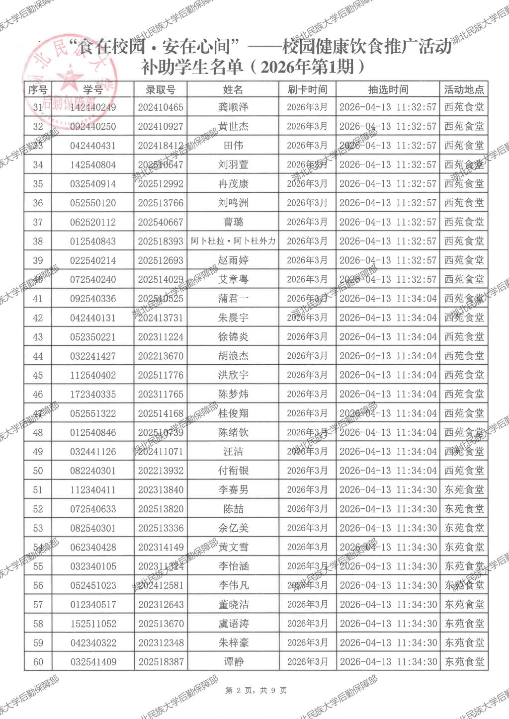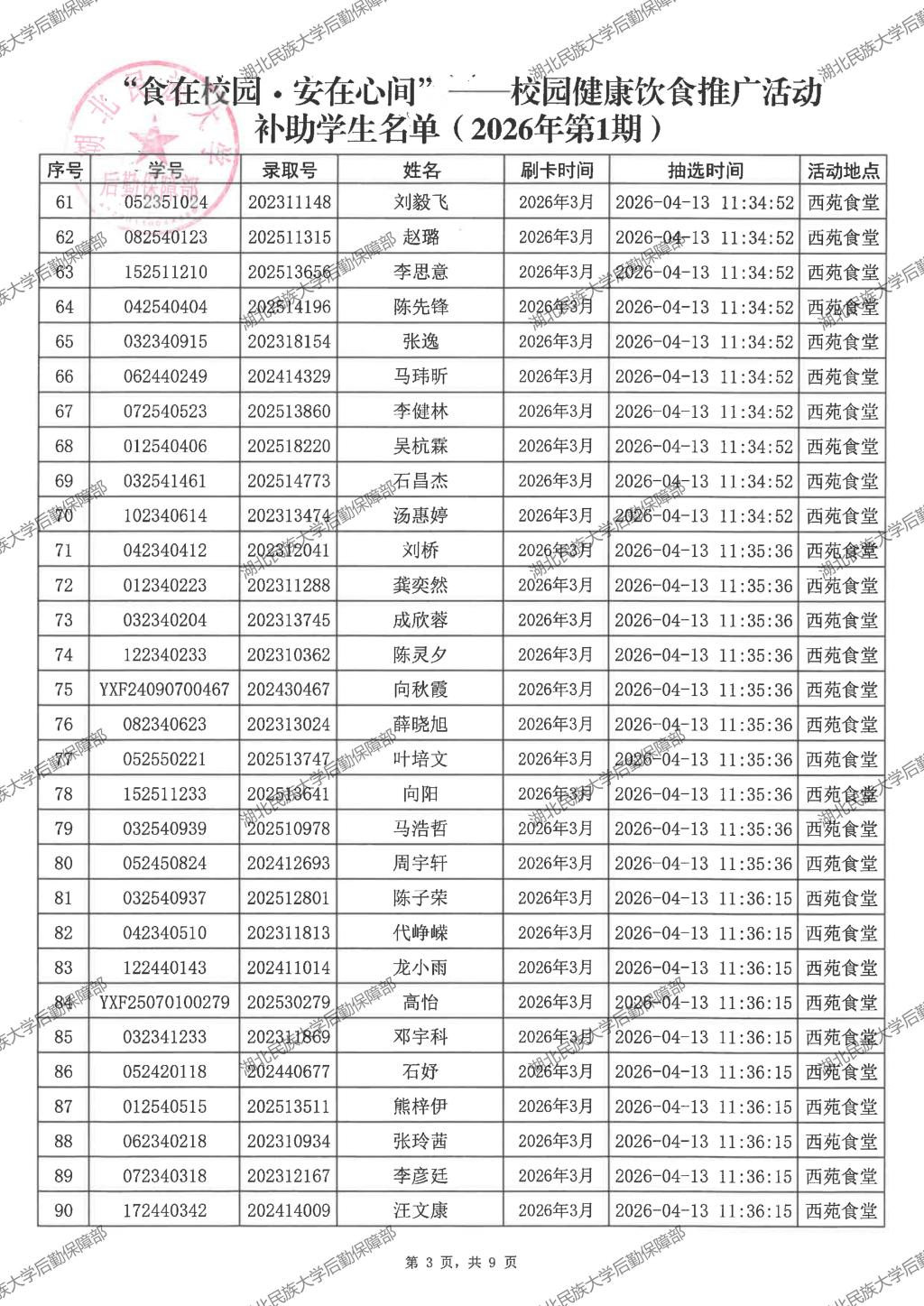 “食在校园·安在心间”——校园健康饮食推广活动(2026年第1期)补助学生名单公示