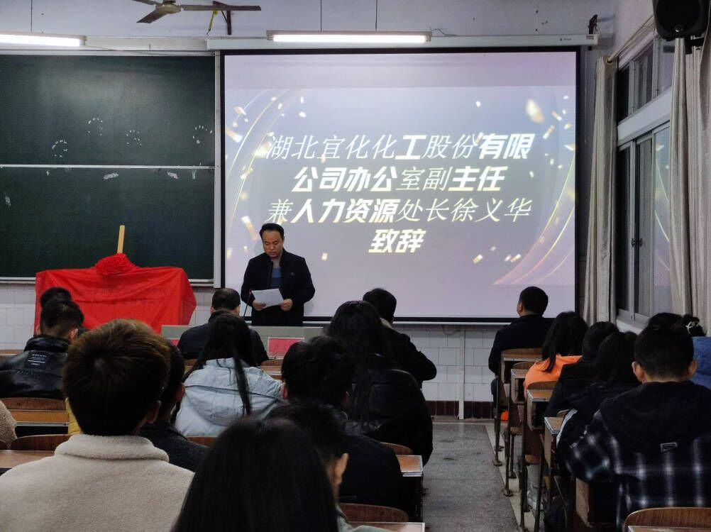 本网讯(通讯员 梅轶宁/文 李彩兰/图)12月18日,化学与环境工程学院与湖北宜化股份有限责任公司在2205教室举办“宜化卓越工程师班”开班仪式,标志着我校与湖北宜化化工股份有限公司校企合作实质性推进。湖北宜化股份有限责任公司办公室副主任、人力资源处处长徐义华,人力资源处招聘经理晏小风,学院党总支书记张刚,院长李国祥,副院长刘应煊,学生科副科长张艺馨,化学工程与工艺专业负责人吴称意,19级化学工程与工艺班主任史伯安出席仪式。开班仪式由张刚同志主持,李国祥同志和徐义华同志分别代表校企双方讲话。
