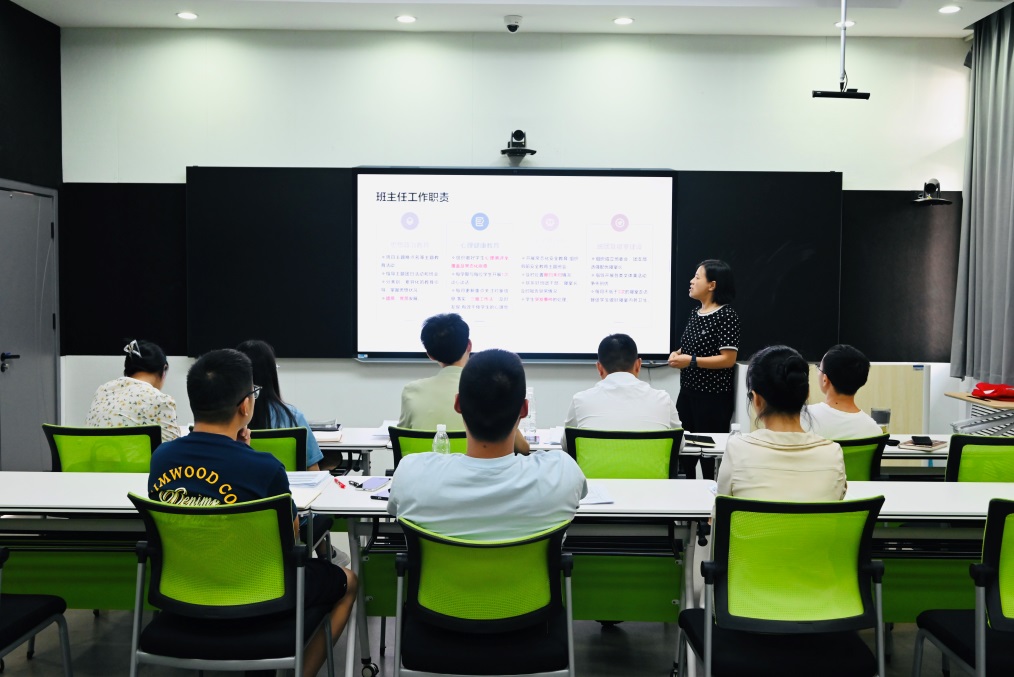 会上,张妮艳从培训的必要性、班主任的角色与工作职责、如何成为一名优秀的班主任等三个维度展开讲解。详细解读了《365电子娱乐官方网站班主任管理规定》中班主任的主要工作内容,重点讲解了新生入学教育、思想政治教育、班团及寝室建设、学年综合素质测评等重点工作,以及心理健康教育、家庭经济困难认定、奖助学金评审、突发事件处理等难点工作。她强调,作为新生班主任,不仅要扎实学习与学生教育、管理、服务相关的文件和制度,同时还要严格遵守工作原则与程序,认真细致地了解学生、真诚平等地对待学生,并学习如何科学处理学生矛盾、做好特殊群体管理和帮助学生消除成长困惑。