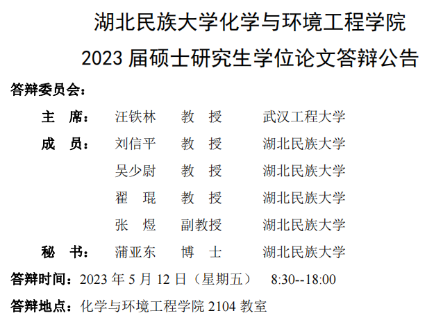 365电子娱乐官方网站化学与环境工程学院2023届硕士研究生学位论文答辩公告(1)