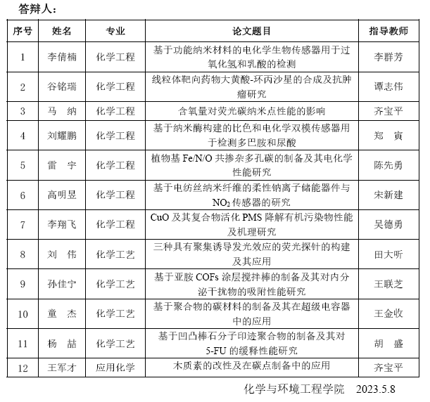 365电子娱乐官方网站化学与环境工程学院2023届硕士研究生学位论文答辩公告(2)
