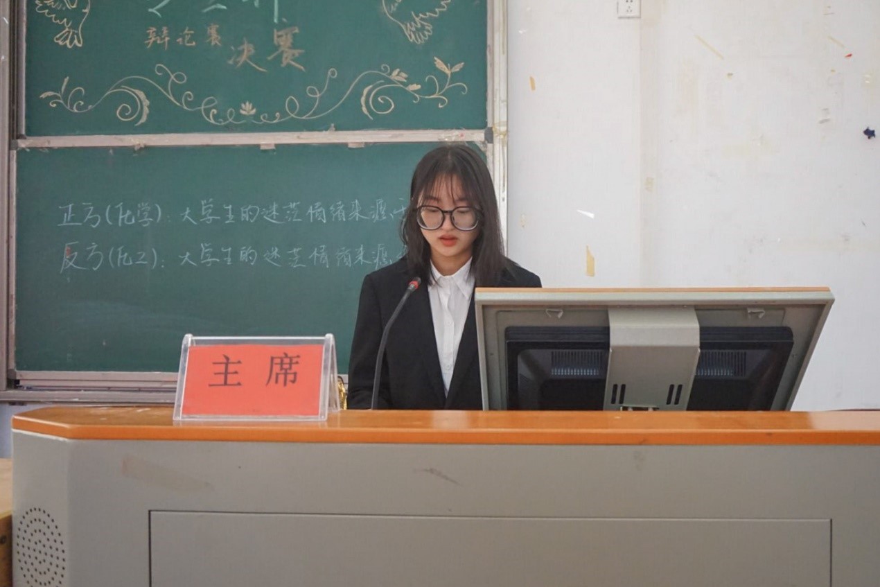 正方为化学专业代表队,反方为化学工程与工艺专业代表队,双方围绕大学生迷茫情绪来自于自身还是社会展开辩论。最终化学专业代表队以89.32分获得此次辩论赛冠军,正方二辩穆凡、反方二辩阳桂慧获得本次决赛优秀辩手。