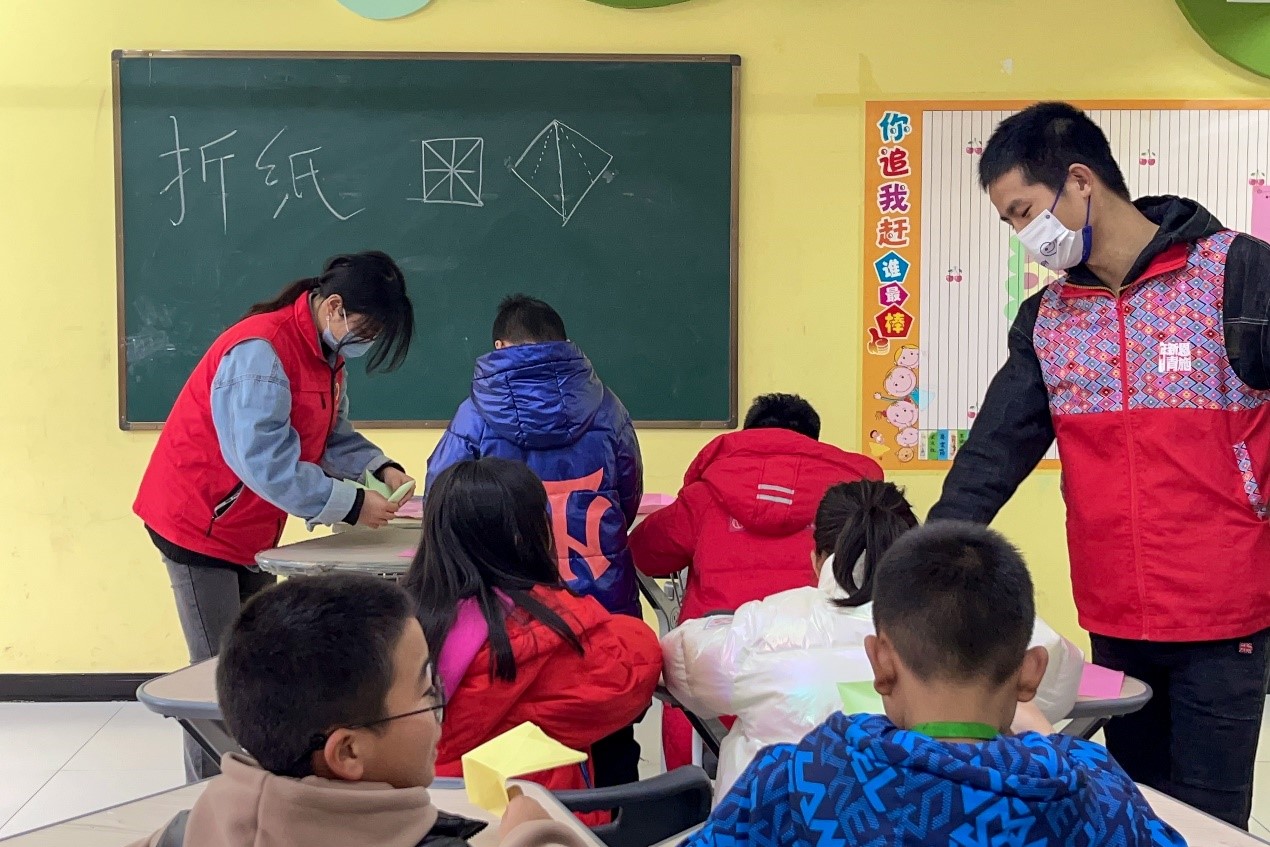 本次活动分为“一张纸的力量小实验”“学唱歌曲”“手工叠纸”三个部分。活动伊始,工作人员将小朋友按年级分为两个班级,并由志愿者们带领着做手指操。随后,志愿者让小朋友们思考将纸放置在杯子上当一架小桥如何才能承受重物,小朋友们跃跃欲试、迫不及待自己动手尝试。志愿者最终将一张纸折叠后再次放重物,并解释这是因为纸折叠过后它的受力面积变小,承压能力变大使重物牢牢不动。在课间休息时,小朋友们跟着伴奏一起律动,吟唱歌曲,露出发自内心的笑容,成功达到寓教于乐目的。紧接着,志愿者对小朋友们一一进行教学叠千纸鹤和玫瑰花。在这个过程中,小朋友们专心致志,跟着志愿者一步一步叠着手中的彩纸,耐心的完成。志愿者鼓励小朋友们回家后将课堂上学习的内容与父母分享,并将自己的叠纸送给家人。最后,由志愿者带领小朋友们拍照留念。本次活动在小朋友们的欢笑声中顺利结束。
