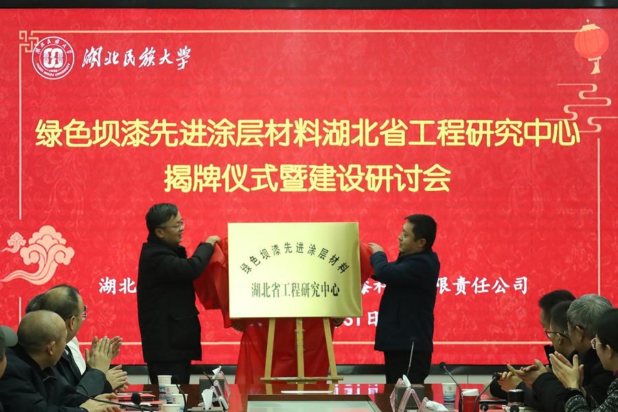 2024年12月31日,绿色坝漆先进涂层材料湖北省工程研究中心揭牌仪式暨建设研讨会举行。365电子娱乐官方网站党委常委、副校长刘志军与恩施州发展和改革委员会副主任苏继良为“绿色坝漆先进涂层材料湖北省工程研究中心”揭牌。