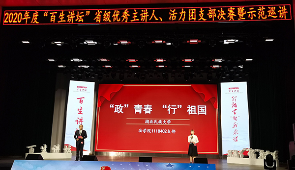 本网讯 (通讯员 tw) 12月9日,由共青团湖北省委、湖北省学生联合会主办的2020年度“百生讲坛”省级优秀主讲人、活力团支部决赛暨示范巡讲在中南财经政法大学南湖会堂举行。我校1118402班团支部参加现场决赛,最终获得第二名,并被授予“金牌团支部”荣誉称号。