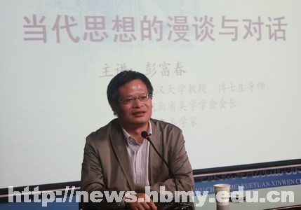 本网讯(记者 杨玲 通讯员 肖灿/文 胡哲源/图)11月28日上午,由文学与传媒学院举办的清江论坛学术讲座之“当代思想的漫谈与对话”在该院附楼演播厅举行,武汉大学博士生导师、湖北省美学学会会长彭富春教授应邀担任主讲。该院党委书记徐铜柱、院长杨光宗、副院长徐定辉等领导老师及近百名同学听取了此次讲座。讲座由该院副院长徐定辉主持。