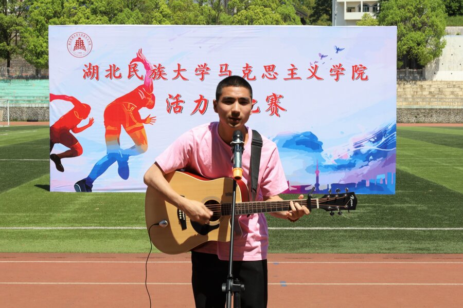 比赛现场,老师杨婷、毛召与25名学生代表进行活力操方阵表演,标准整齐的动作尽显风范;李明江带来吉他弹唱《我们的时光》,轻快愉悦的歌声营造温暖的现场气氛,引发观众关于时光的思考。