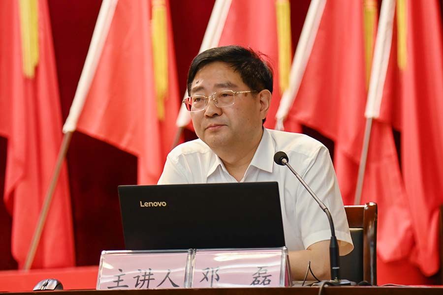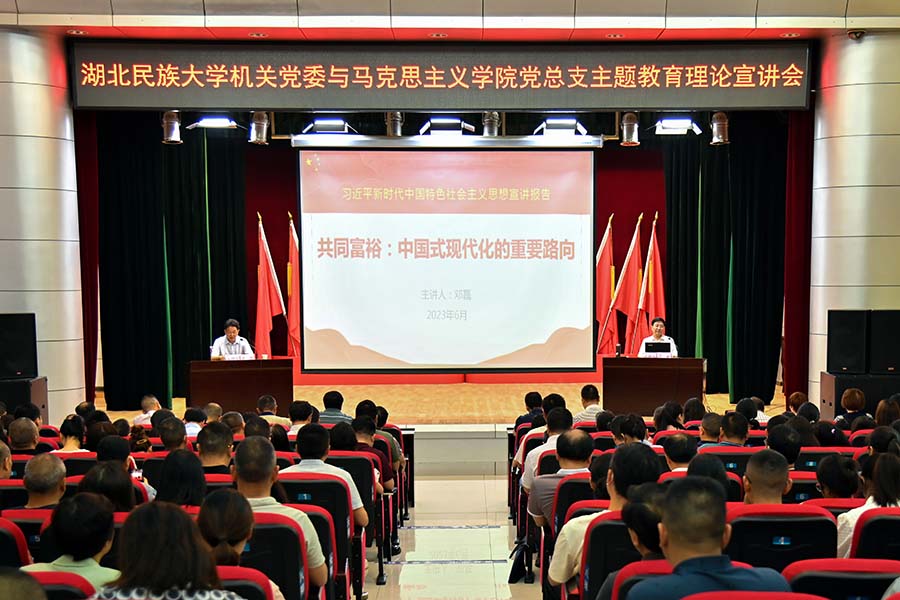 6月2日,365电子娱乐官方网站学习贯彻习近平新时代中国特色社会主义思想主题教育理论宣讲会在行政楼1号会议室举行。机关党委、马克思主义学院党总支举行主题教育联学活动,共同聆听学校党委副书记邓磊教授围绕“共同富裕”进行的主题宣讲。学校机关党委党员和马克思主义学院教职工、学生党员参加宣讲报告会。机关党委书记、党委组织部常务副部长洪雁主持宣讲会。