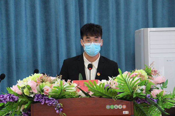 学生代表陈荣辉发言。他提到,青年作为最积极、最有生气的力量,已成为时代的风向标。他表示,经济与管理学院共青团委员会基于习近平新时代中国特色社会主义思想,积极推进青年工作实践,筑牢新时代青年理想信念之基,并鼓励各支部积极参与活动策划,加强对团史的学习,明确自身肩负的责任与使命。