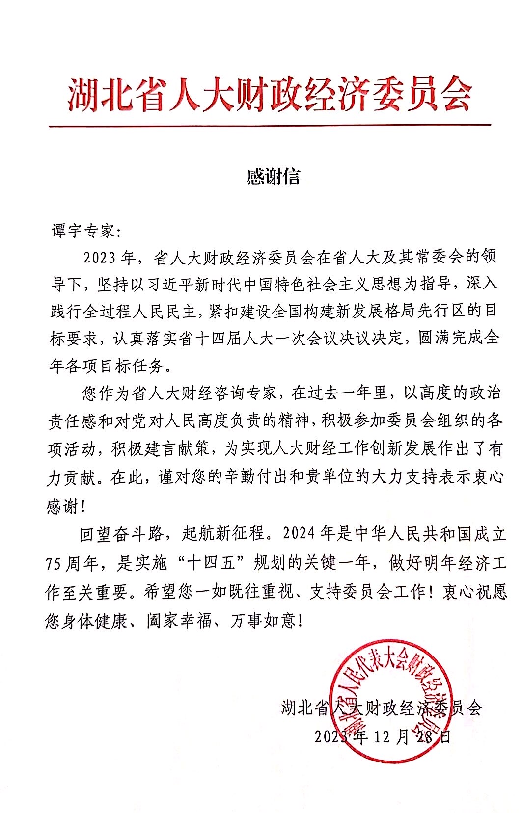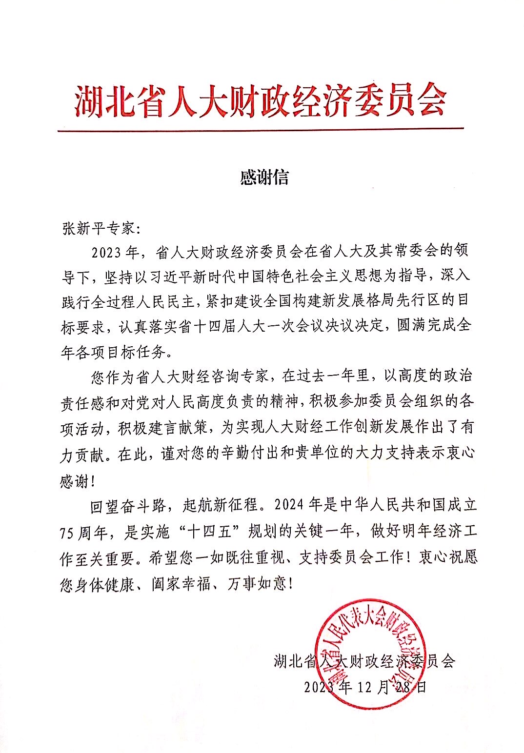 经济与管理学院张新平教授、谭宇教授收到湖北省人大财经经济委员会感谢信