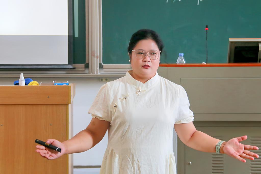 杨佳讲话。她详细介绍国际经济与贸易专业的课程设置及能力培养方案,加深学生对专业就业方向和未来发展前景的了解,并通过中美关税变动、“一带一路”等实例,帮助学生了解国家贸易的重要性,建立学生的专业认知。她希望学生能够尽早明确学习目标,坚定自身方向,做到胸怀家国、博古通今、顶天立地、知行合一,将爱国情怀贯彻始终。