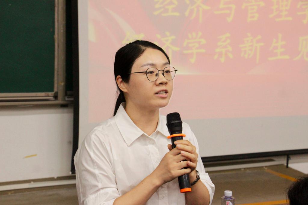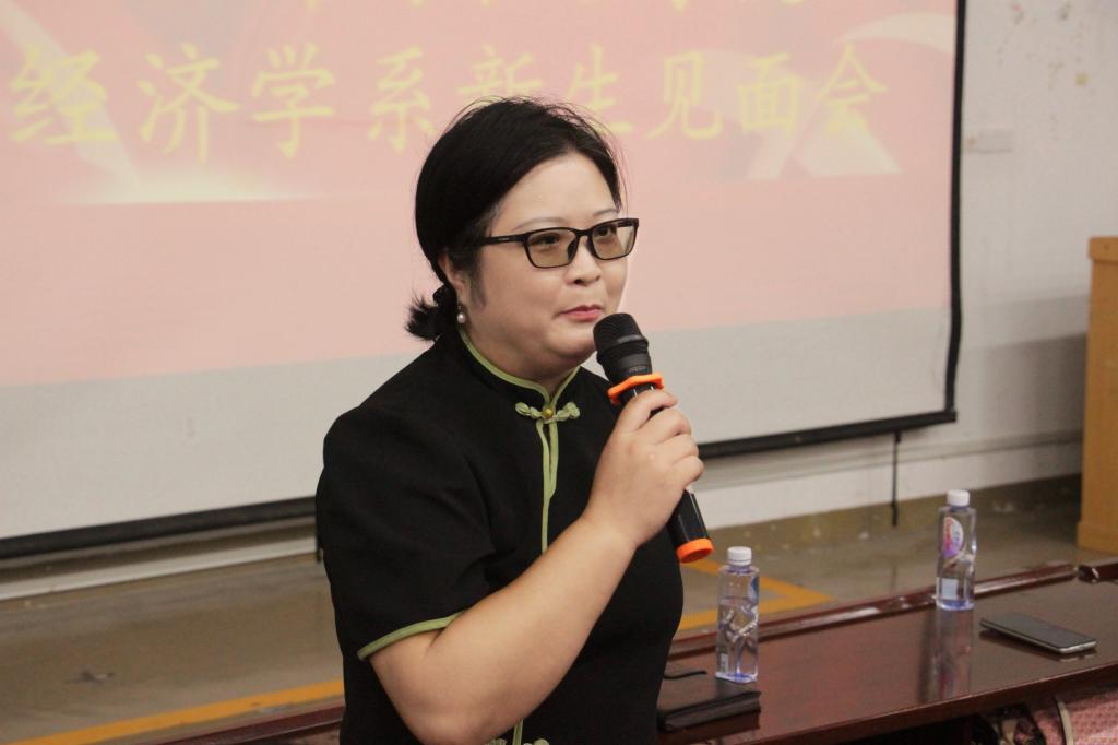 杨佳讲话。她欢迎各位新生加入经济学系这个温暖、团结、充满力量的大家庭,并希望学生在未来四年惜时奋进、努力奋斗,在美丽的桂花园里绽放最美的青春,实现心中的梦想,到达更辉煌的彼岸。