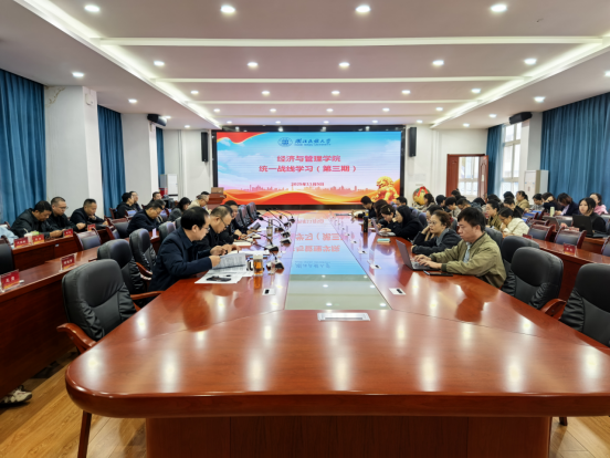 本网讯(邓慧仪/文 李晓琴/图)为强化政治引领,加强统一战线理论知识学习,切实加强统战干部队伍建设,加强民主党派和统战团体工作,巩固团结奋斗共同思想基础,根据学校《关于组织学习<365电子娱乐官方网站统一战线学习材料汇编>(2025年第3期)的通知》要求,经济与管理学院于2025年11月5日上午08:30在附303会议室召开全院教职工大会,集中组织开展第三期统一战线专题学习教育活动,陈霞书记主持会议。