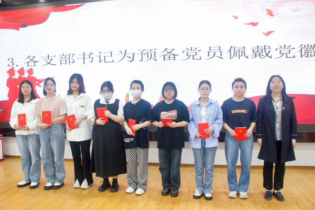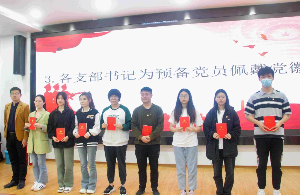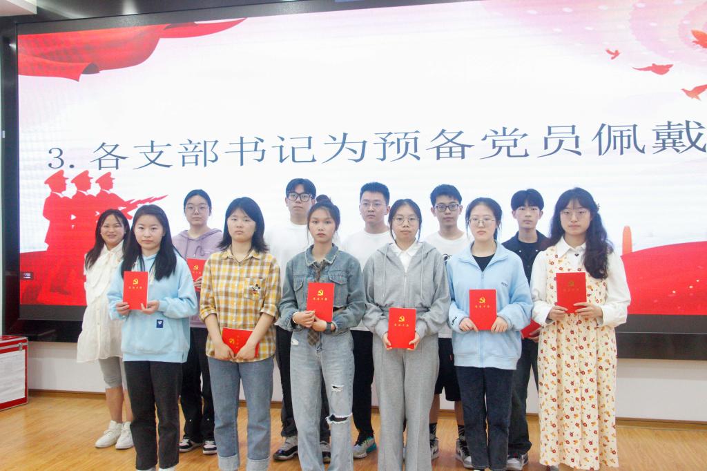 会议伊始,全体人员起立奏唱国歌。曹骞宣读预备党员名单。各支部书记为预备党员佩戴党徽,并为学生党员寝室授牌。最后,29名预备党员面对党旗庄严宣誓。