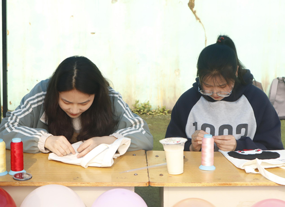 活动现场,志愿者耐心解答参与者的问题并提供所需服务。参与者可充分发挥其动手能力, 将现场提供的卡通图案、彩色花朵、英文字母等材料缝制在纯白色手提包、笔袋、衣物上。活动最后所获物品将由社团工作人员在特定时间捐赠给恩施州中心医院的白血病患儿和艺萌康复中心儿童。