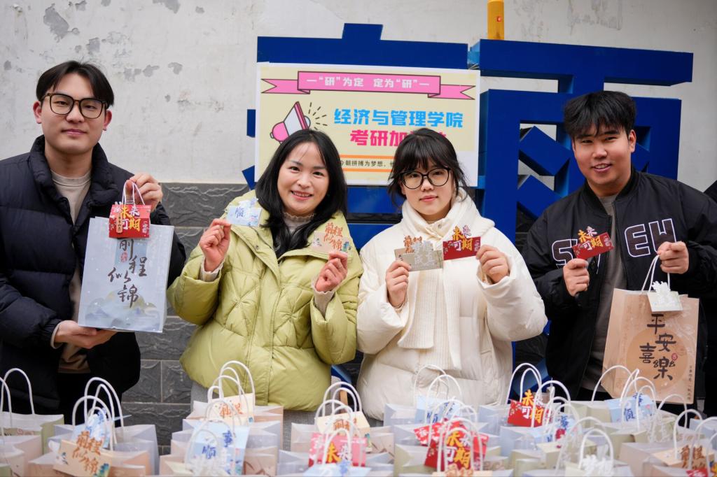 本网讯(记者 李佳怡/文 黄俊毅/图)为缓解考研学子的压力及紧张情绪,增强考研学子的考研信心,助力考研学子以最佳状态迎接考试,2024年12月20日,经济与管理学院以“一‘研’为定 定为‘研’一”为主题的考研送温暖活动在春雨社区举行。经济与管理学院部分师生参与本次活动。