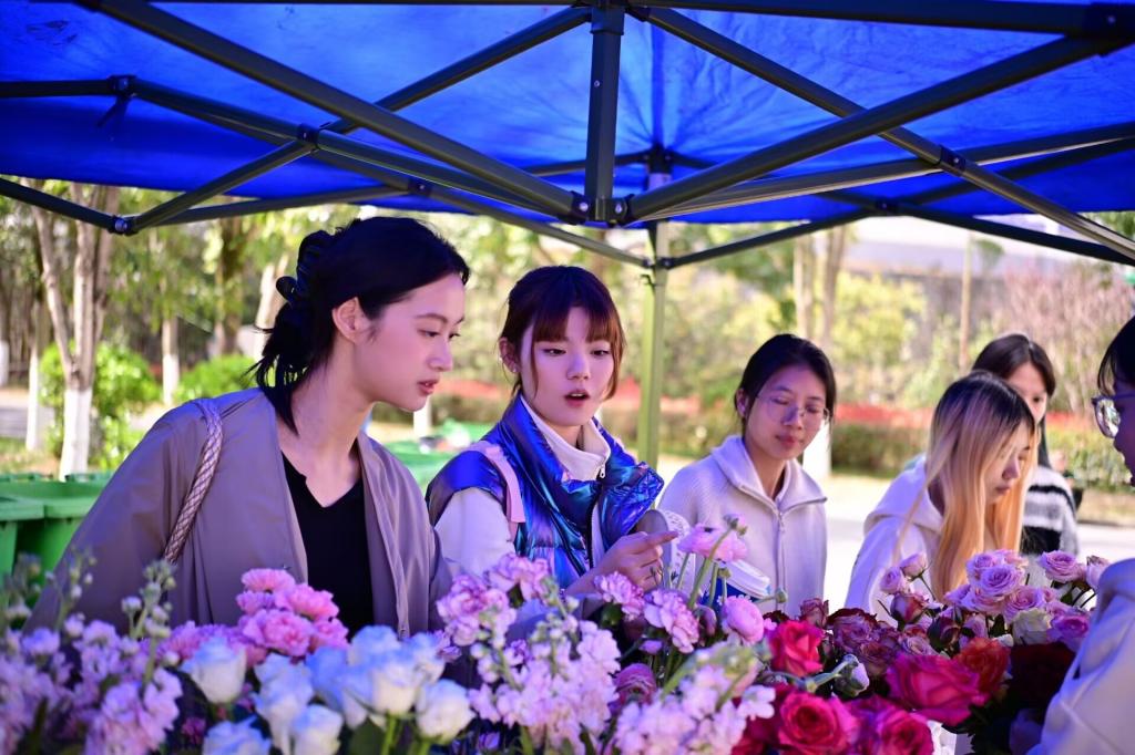 活动当天,春雨社区的活动现场摆满鲜花,吸引学生驻足参加。参与活动的学生早早来到现场,在工作人员处登记自己提前准备好的闲置物品,便前往展示区挑选心仪的鲜花。活动现场弥漫着分享的喜悦与互动的温情,学生所交换的每一件物品都化作传递爱心的纽带,承载着非凡意义。在交换的过程,学生在工作人员准备的卡片上写下近期的心情或者真挚的话语,让学生因文字结缘,拉近学生间距离。这些卡片被悬挂在展示墙上,成为一道独特的风景线,传递着学生内心的温暖情感。
