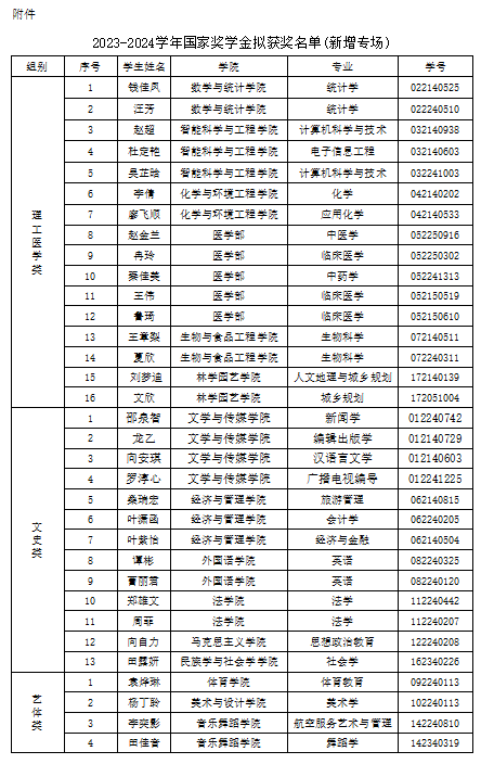 根据《财政部 教育部 人力资源社会保障部 退役军人部 中央军委国防动员部关于印发 < 学生资助资金管理办法 > 的通知》(财教〔2021〕310 号)、《财政部教育部人力资源社会保障部关于调整高等教育阶段和高中阶段国家奖助学金政策的通知(财教〔2024〕181号)(1)》、《湖北省学生资助管理中心关于做好2023-2024学年本专科生国家奖学金初评工作的通知》、《365电子娱乐官方网站本科学生国家奖学金实施细则》(民大校办发〔2024〕23号)、《关于开展2023-2024学年国家奖学金评审工作的通知(新增专场)》等文件精神,经学生个人申请、班级评议、各学院初评推荐、学生工作处组织评审,经济与管理学院2021级旅游管理专业062140815桑瑞宏、2021级经济与金融专业062140504叶紫怡、2022级会计学专业叶潇函062240205荣获2023-2024学年本科生国家奖学金。