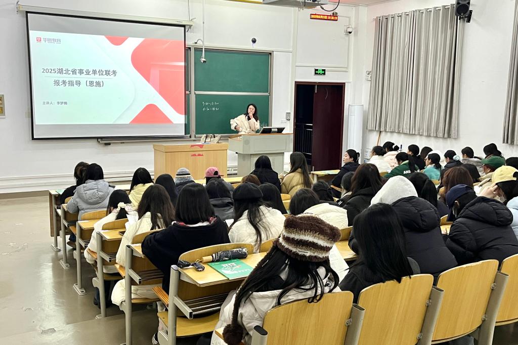 本网讯(记者 周京京/文) 2025年2月23日,经济与管理学院组织的2025年事业单位专场指导讲座在修远楼5B303教室举行,此次讲座邀请了华图资深专业教师为到场的100余名学生提供了详尽的备考策略。