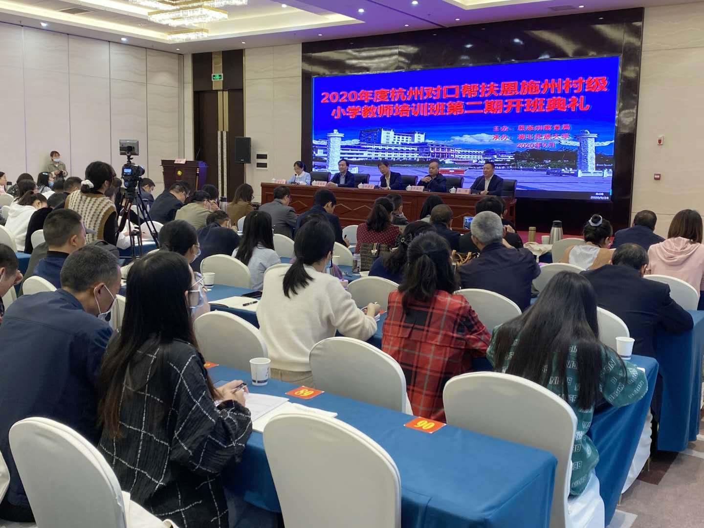 9月24日,恩施州村级小学教师第二期培训班开班典礼在华龙村大酒店宴会中心三楼多功能会议室一号厅举行,学校副校长祝建波、恩施州教育局副局长王俊杰及300名村级小学教师参加典礼。