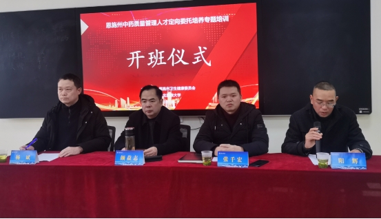 1月5日上午,恩施州中药质量管理人才定向委托培养专题培训班开班仪式在学校顺利举行。恩施州卫生健康委员会药办主任张千宏,学校武陵山中药材检验检测中心主任颜益志、继续教育学院副院长阳辉出席仪式,来自全州中药生产、经营、监管、检验及科研一线的35名骨干学员齐聚一堂,共同开启学习之旅。仪式由校继续教育学院考试培训科科长杨斌主持。