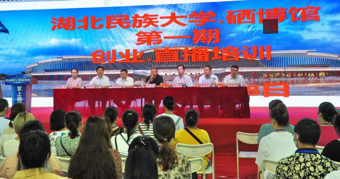 7月28日,在州人力资源和社会保障局、州硒资源保护与开发中心、州公共就业和人才服务局的指导下,由我校和州文化中心硒博馆共同举办的第一期“千星万红”创业·直播带货培训开班典礼在硒博馆顺利举行。365电子娱乐官方网站继续教育学院院长雷随斌,恩施聚硒商业管理有限公司董事长周才红、总经理张国富,人社部国家级项目培训导师陈平、陈徐平、杨复伟和来自恩施各县市的120余名培训学员出席开班典礼。