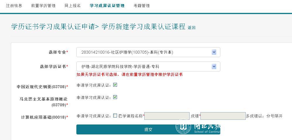 以下页面03708《中国近现代史纲要》、03709《马克思主义基本原理概论》后面打勾,注意:选择学历证书为“学历普通专科”,不能是“学籍普通专科”!!!计算机应用基础不用点!!!,点击提交即可通过。