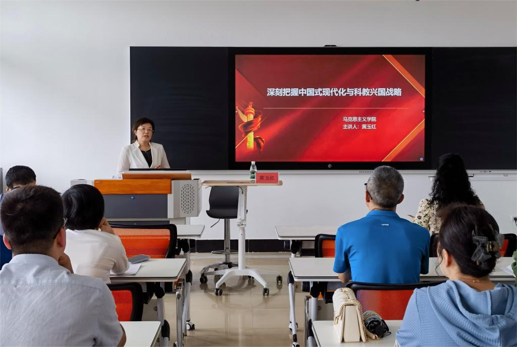 黄玉红首先明确学习贯彻习近平新时代中国特色社会主义思想主题教育“学思想、强党性、重实践、建新功”的总要求及根本任务,紧接着围绕党带领人民成功走出中国式现代化道路、中国式现代化的中国特色和本质要求、以高质量科教兴国战略推进中国式现代化三个方面对习近平新时代中国特色社会主义思想的内涵进行了系统、深刻的阐释。她认为,教育、科技、人才要一体推进,而高校作为教育阵地、科技重地、人才高地的结合体,更是承担着人才培养、科学研究、社会服务、文化传承创新、国际交流合作等五大职能,在推进中国式现代化进程中必将起到关键性的支撑作用,这也是新时代新征程赋予高等教育的历史使命和时代课题。宣讲内容详实、观点深刻、逻辑清晰,全体教师受益匪浅。
