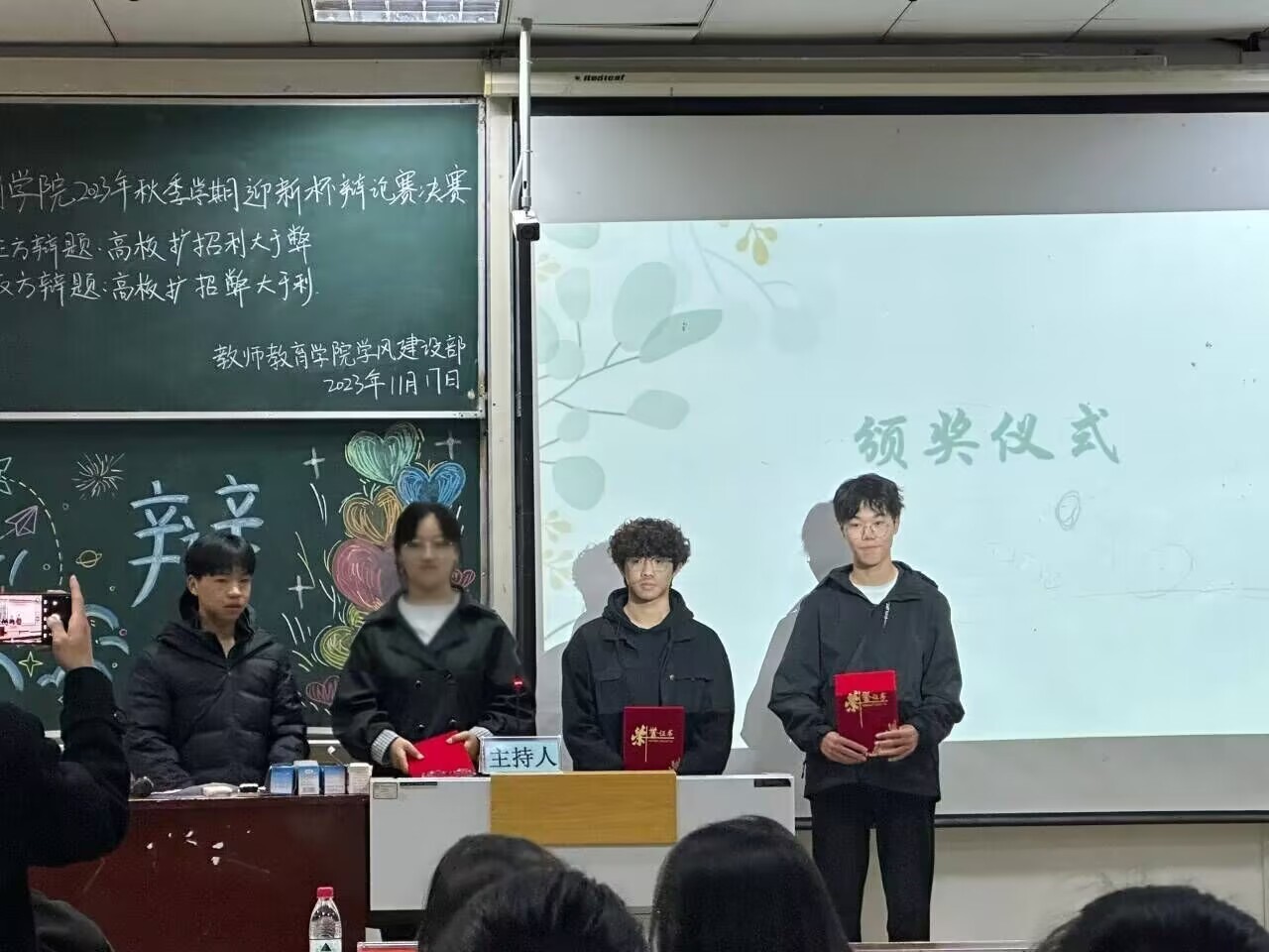 本次决赛共设两个辩题:一是“教师师德规范重要,还是专业技能重要”,二是“高校扩招利大于弊,还是弊大于利”。辩论过程中,双方辩友唇枪舌战、旁征博引,应变能力敏捷,逻辑思维缜密,现场气氛迅速升温,将比赛推向高潮,为观众们奉献了一场思辨的盛宴,赢得了观众阵阵热烈的掌声,赛出了风采,赛出了水平。两位老师对比赛进行了精彩的点评,并对选手提出了建议。最终,刘双怡、张浩同学荣获最佳辩手称号。
