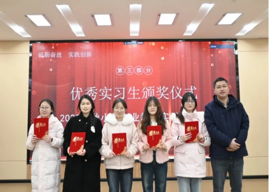 表彰环节,邱世兵、员恒强、卢浩宇依次为谢丽媛等优秀实习生颁奖,肯定他们在实习中的突出表现,鼓励大家继续深耕教育领域,共同见证同学们在实践中的成长与蜕变。