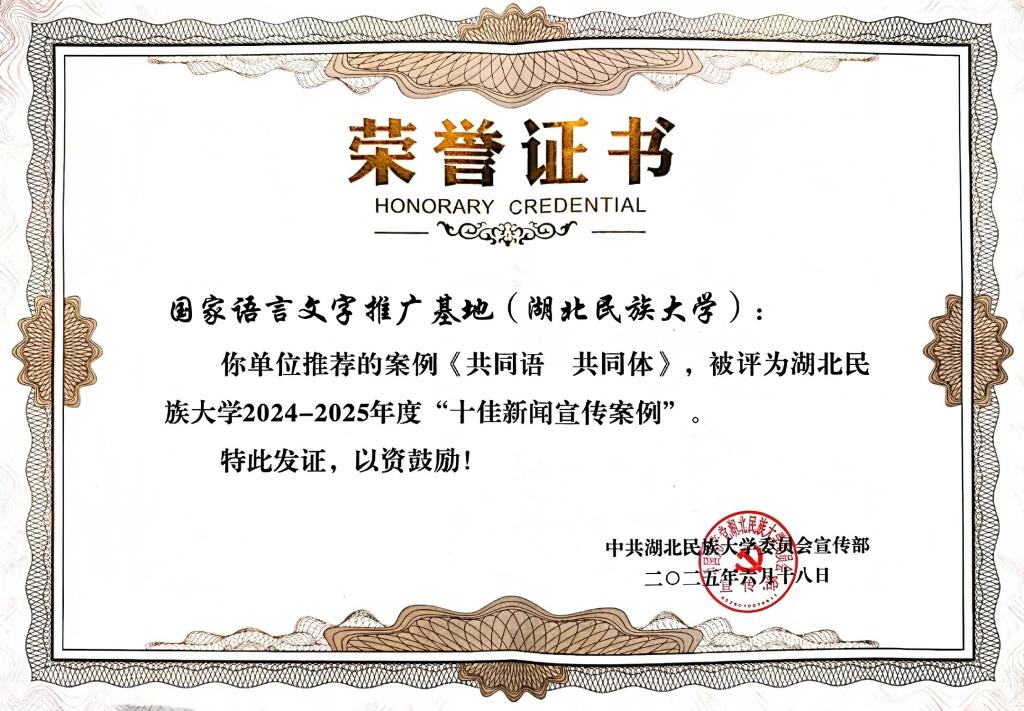 2025年6月20日,由湖北民大国家语言文字推广基地创编、基地成员倾情参演的情景剧《共同语 共同体》荣获365电子娱乐官方网站2024-2025年度"十佳新闻宣传案例"。