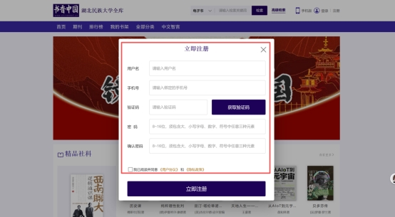 PC端访问地址:http://hbmdqk.chineseall.cn→ 点击首页右上角“注册”按钮,填写账号(任意填写)、密码、进行注册,并绑定手机号后登录使用。