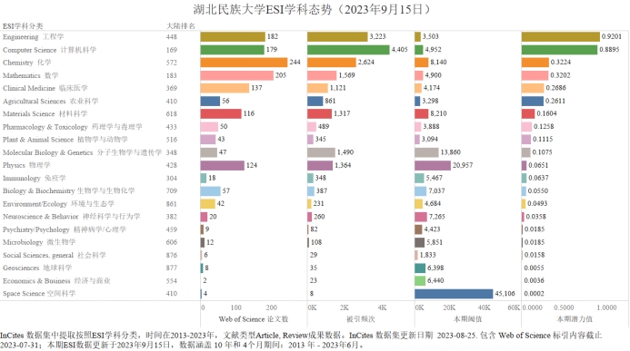 本期我校ESI学科分类数据来看,发文量最多的学科为Chemistry 化学244篇,引用量最高的学科为Computer Science 计算机科学4405次,潜力值最高的学科为Engineering 工程学0.9201。
