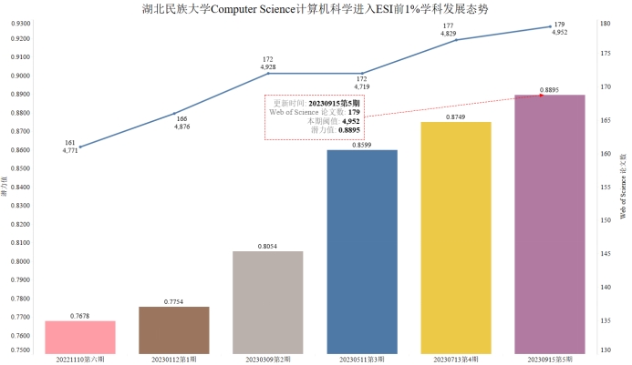 本期我校有望进入ESI前1%的学科为Computer Science 计算机科学,潜力值为0.8895,论文数179,引用量4405,本期入围阈值为4952。