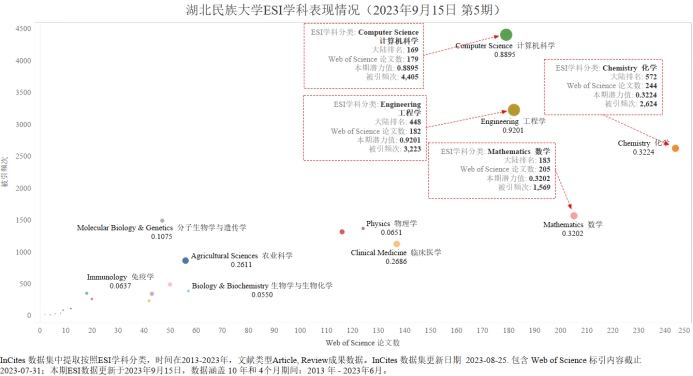 为了解我校学科进入ESI前1%的潜力情况,选取InCites 数据集2013-2023年数据(InCites 数据集更新于2023-08-25. 包含 Web of Science 标引内容截止 2023-07-31)。对我校有望入围ESI前1%潜力学科情况进行分析,我校发表SCIE/SSCI论文1561篇,论文总被引20319次。Engineering 工程学,潜力值为0.9201,论文数182,引用量3223;Computer Science 计算机科学潜力值为0.8895,论文数179,引用量4405。