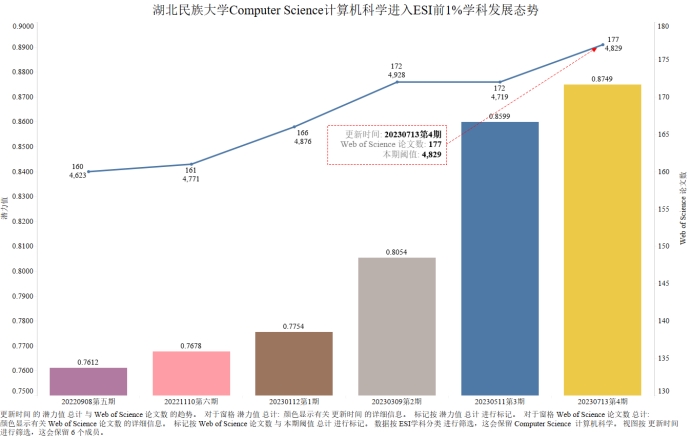 本期我校有望进入ESI前1%的学科为Computer Science 计算机科学,潜力值为0.8749,论文数177,引用量4225,本期入围阈值为4829。