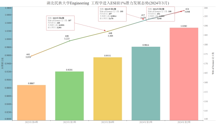 本期我校有望进入ESI前1%的学科为Engineering 工程学,潜力值为1.0282,论文数198,引用量3648,本期入围阈值3548。