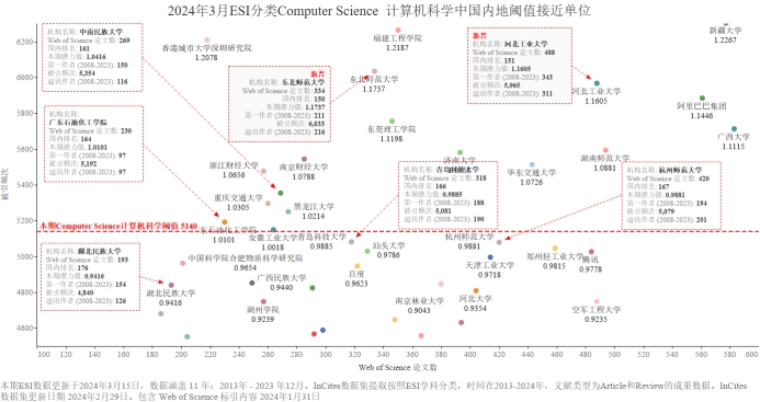 本期我校有望进入ESI前1%的学科为Computer Science 计算机科学,潜力值为0.9416,论文数193,引用量4840,本期入围阈值5140。
