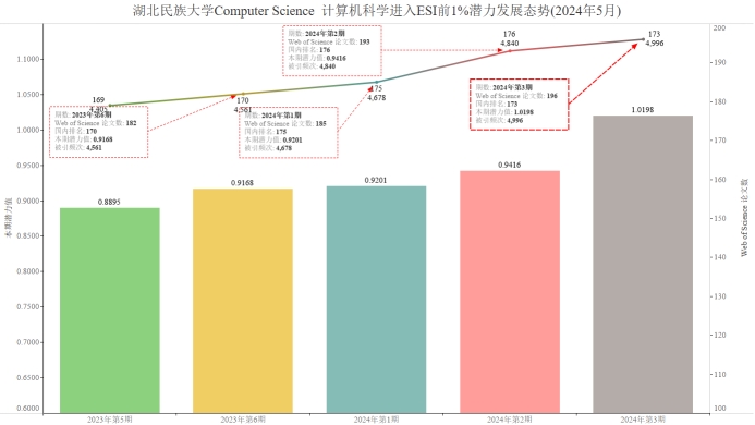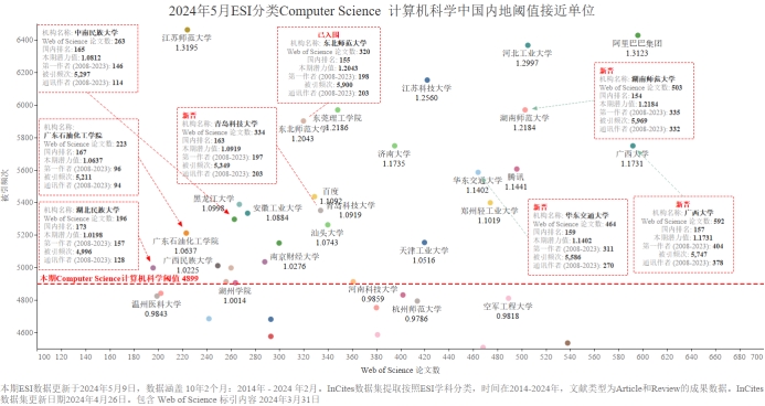 本期我校有望进入ESI前1%的学科为Computer Science 计算机科学,潜力值为1.0198,论文数196,引用量4996,本期入围阈值4899。由于潜力值比实际略有偏高,尽管本期Computer Science 计算机科学潜力值为1.0198大于1,仍尚未入围ESI学科前1%。
