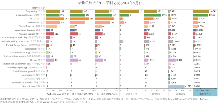 根据基本科学指标数据库(Essential Science Indicators,简称ESI)2024年5月9发布的最新数据显示(2024年5月9日更新,数据涵盖10年2个月:2014年 - 2024 年2月),本期共有9019家研究机构进入ESI全球前百分之一,我校尚未有学科进入ESI学科前1%。