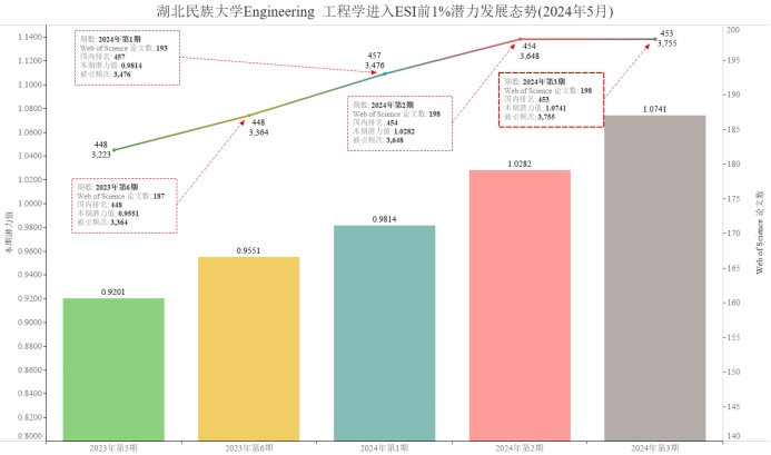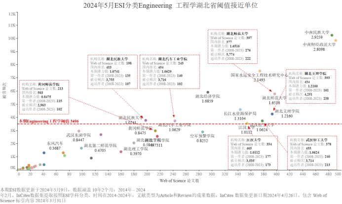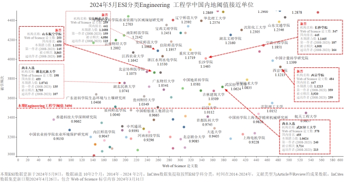 本期我校有望进入ESI前1%的学科为Engineering 工程学,潜力值为1.0741,论文数198,引用量3755,本期入围阈值3469。由于潜力值比实际略有偏高,尽管本期Engineering 工程学潜力值为1.0741大于1,仍尚未入围ESI学科前1%。